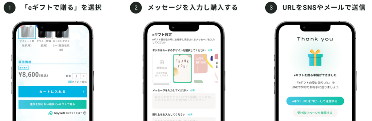 AnyGiftは、相手の住所を知らなくてもLINEやメールで贈ることができる「eギフト機能」を、ECサイトに組み込むことができるサービスです。今回、AnyGiftの提供により、「アンファーストア」にて人気の商品がeギフトとして贈れるようになりました。