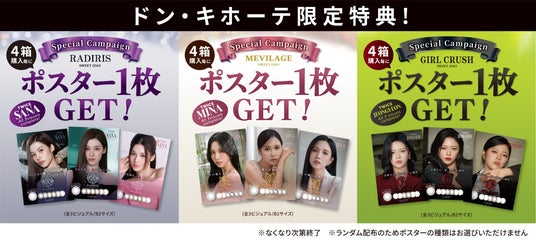 株式会社スウィート(本社所在地:大阪府大阪市中央区、代表取締役CEO:萱間 美都里)は、世界的ガールズグループTWICEのSANA(サナ)、MINA(ミナ)、JEONGYEON(ジョンヨン)をカラーコンタクトレンズシリーズ「SWEET 1 DAY」のブランドアンバサダーとして迎え、3つの新商品を2025年11月7日(金)より順次発売開始しております。この度、新商品発売を記念して全国のドン・キホーテ限定でキャンペーンを開催することが決定しました。SANA(サナ)のRADIRIS(ラディリス)、MINA(ミナ)のMEVILAGE(メビラージュ)、JEONGYEON(ジョンヨン)のGIRL CRUSH(ガールクラッシュ)それぞれの商品を4箱購入毎にオリジナルポスターを1枚プレゼント。更に、2箱購入毎に抽選付きトレカを贈呈致します。抽選の当選者には、SANA(サナ)、MINA(ミナ)、JEONGYEON(ジョンヨン)本人の直筆サイン入りポスターが当たる、豪華特典内容です。また、ドン・キホーテ限定販売カラーの「ナイトオーキッド」、「フローラルブルー」、「サイレントジェイド」も登場。ぜひ全国の店舗に足をお運びいただき、特別なキャペーンをお楽しみください。
