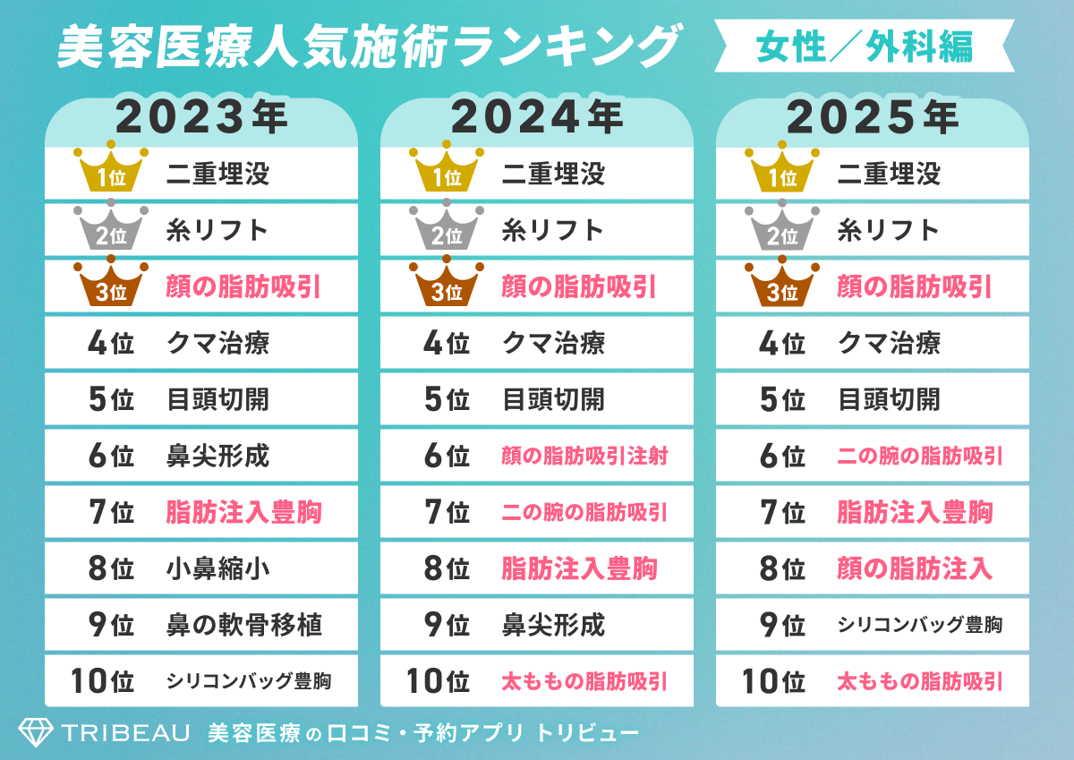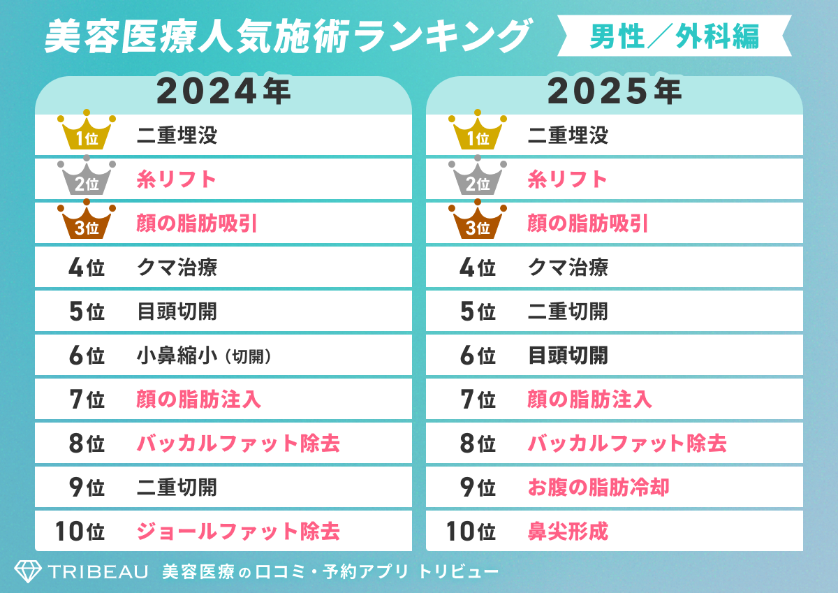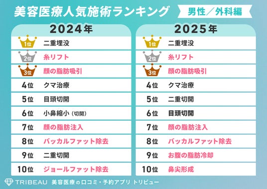 2024年に引き続き【1位:二重埋没】【2位:糸リフト】【3位:顔の脂肪吸引】がトップ3にランクインし、“自然な変化”を求めるニーズがより明確になりました。また、今年は【9位:お腹の脂肪冷却】が新たにランクインしており、「ボディの脂肪吸引」よりも手軽にボディラインを変えたいという願望が伺える点にも注目です。