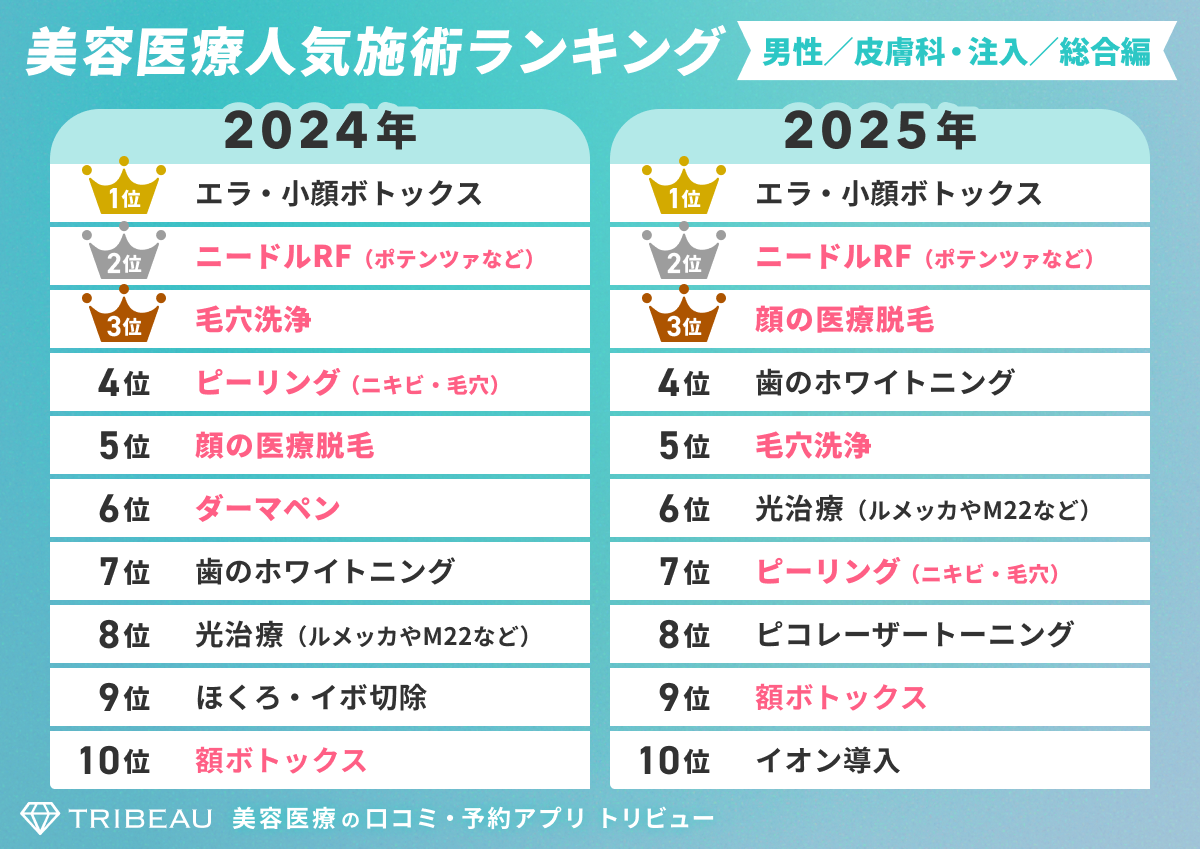 今年も「即効性」「分かりやすい効果」がキーワード。【1位:エラ・小顔ボトックス】は、「輪郭がすっきりする」「ダウンタイムがなく仕事にも支障がない」といった理由で男性人気が継続。【2位:ニードルRF(ポテンツァなど)】【5位:毛穴洗浄】【7位:ピーリング】など、肌質改善ニーズも高まっており、肌管理が“身だしなみ領域”として浸透していることが読み取れます。女性のランキングには含まれていない【3位:顔の医療脱毛】は「ヒゲ脱毛」。また、【10位:額ボトックス】が継続的にランクインしているのは、額を出すヘアスタイルが多い男性ならではの特徴とも言えそうです。