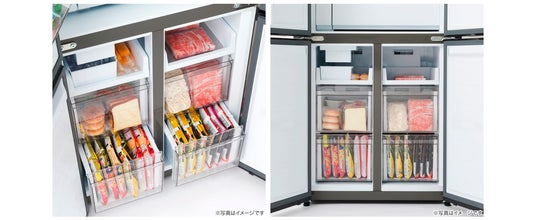 本商品は、業界最薄(※1)となる奥行約59cmの薄型設計で、奥の食材も取り出しやすく、キッチン内での動線も確保しやすいのが特長です。整理しやすい引き出し式クリア6BOX冷凍庫や、週末のまとめ買いに便利な「急冷蔵」「急冷凍」モード、自動製氷機能など充実の機能を備え、さらに5年間の無償保証付きで税込99,900円という価格を実現しました。今までの常識を変える大型冷蔵庫です。