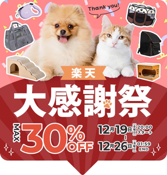 【最大30%OFF!楽天大感謝祭】犬・猫のペット用品をお得にまとめ買い。年末の長時間移動・帰省シーズンを快適にするアイテムから、毎日に役立つ商品まで、人気アイテムを”期間限定のセール価格”でご提供。