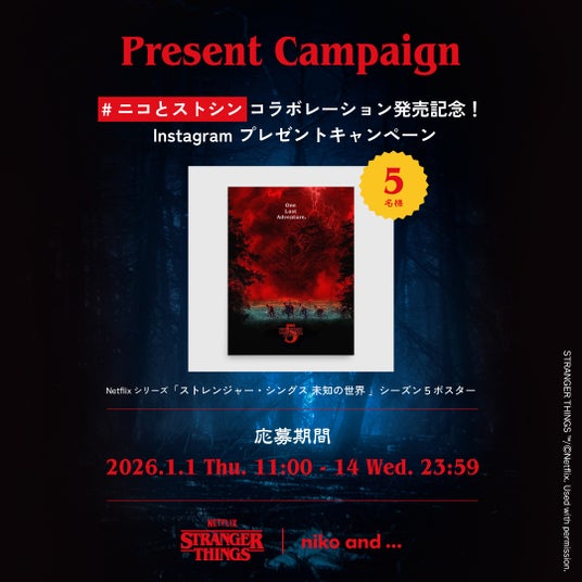 “Play fashion!”をミッションに掲げるアンドエスティHDグループで、40以上のマルチブランドを展開する株式会社アダストリア(本部:東京都渋谷区渋谷2-21-1、代表取締役社長:北村 嘉輝)の展開するスタイルエディトリアルブランド「niko and ...(ニコアンド)」は、Netflixシリーズ「ストレンジャー・シングス 未知の世界」のコラボレーションアイテムを発売に先駆けて、2025年12月19日(金)より、特設ページにて本コラボレーション全商品ラインアップと、スペシャルプレゼントキャンペーン情報を公開いたします。2026年1月1日(木)より、「niko and ...」国内全店舗、公式WEBストア and ST(アンドエスティ)などのオンラインストアにて、また「niko and ... COFFEE(ニコアンド コーヒー)」各店では飲食コラボメニューを期間限定で発売します。さらに、「niko and ...」国内全店舗の年始営業から、店内の商品をご購入いただいたお客さまにNetflixシリーズ「ストレンジャー・シングス 未知の世界」のアートをあしらったナップサック型のオリジナルビニールショッパーを提供いたします。また、SNS上では「#ニコとストシン」SNSプレゼントキャンペーンを「niko and ...」の公式X、Instagramの各種アカウントで、Netflixシリーズ「ストレンジャー・シングス 未知の世界」の公式グッズが当たる企画を開催します。