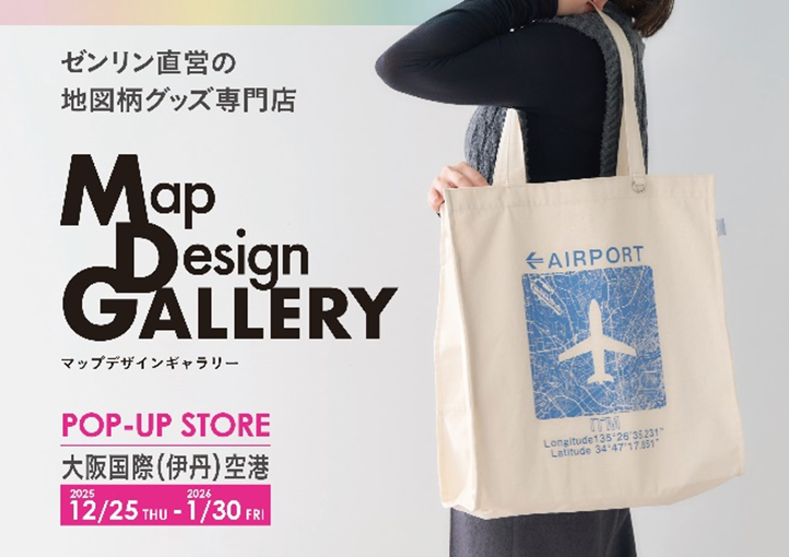 株式会社ゼンリン(本社:福岡県北九州市、代表取締役社長:竹川道郎、以下ゼンリン)は、2025年12月25日(木)から2026年1月30日(金)まで、地図がデザインされた文具・雑貨を販売するブランド「Map Design GALLERY」のPOP-UP STOREを、大阪国際(伊丹)空港中央ターミナル2階インフォメーション前に期間限定でオープンします。限定商品として地図柄のキャンバストートバッグやヒノキマグネットなどを販売するほか、大阪の難読地名が含まれる方面看板アクリルスタンドキーホルダーの新ラインナップ等を販売します。