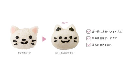 「にゃんこおにぎりセット」は当社のロングセラー「おむすびニャン」をリニューアルしたアイテム。従来の親しみやすさはそのままに、お顔の輪郭や耳の形を一から考え直し、シンプルでやさしいフォルムにリデザインしました。
