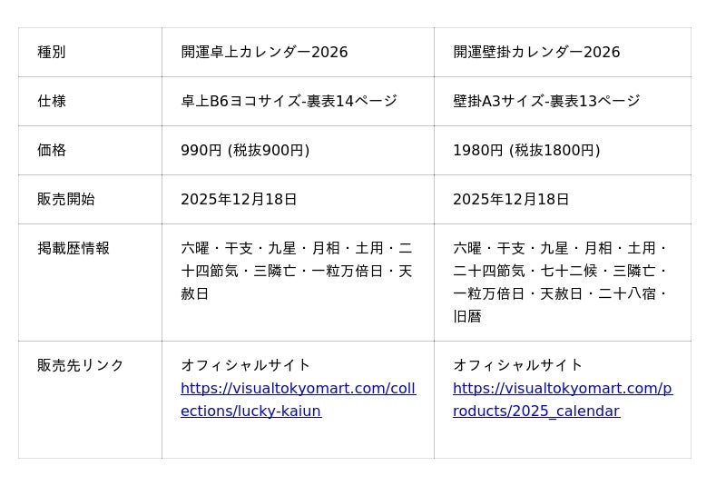 株式会社ビジュアル東京株式会社ビジュアル東京(本社:東京都渋谷区)は、鏡月鑑定事務所監修による運気の流れが一目でわかる『2026年1月始まり 開運カレンダーシリーズ』を12月19日(金)より発売開始いたしました。