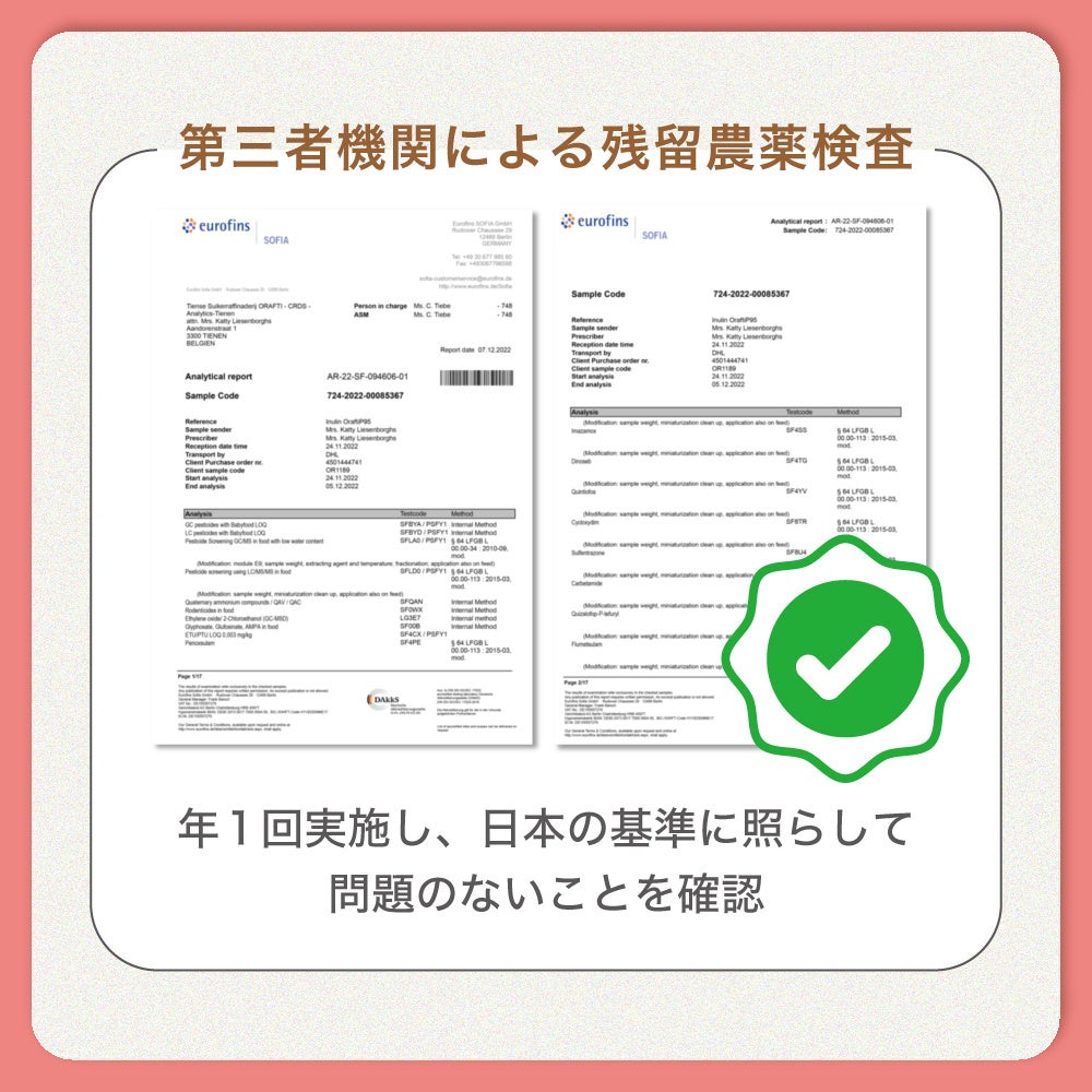 第三者機関による残留農薬検査を年1回実施し、日本の基準に照らして問題ない事を確認しています。