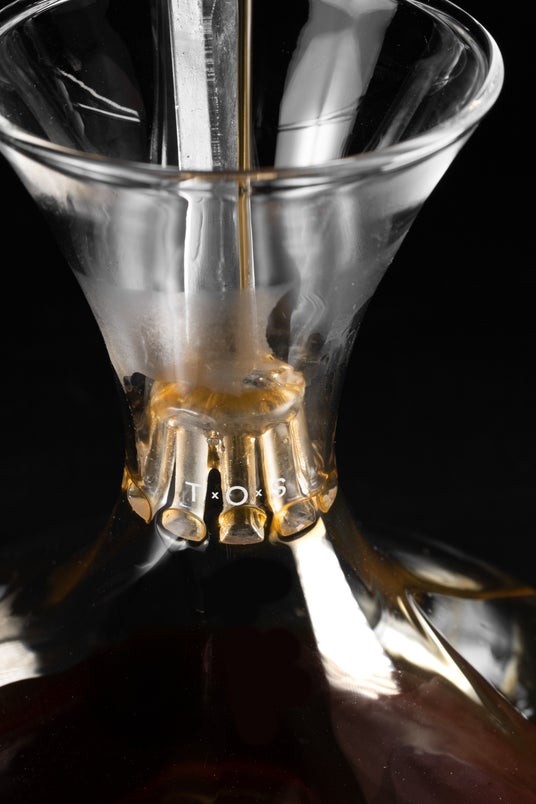 ガラスカラフェには、専用パーツのディストリビューターをセットすることで、コーヒーが真下に落ちるのではなく、カラフェの壁面を伝って美しく流れ落ちます。