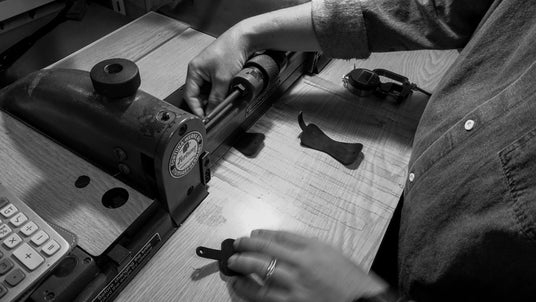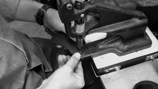 革の状態を見ながら、抜型を配置して機械で裁断する。