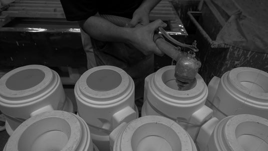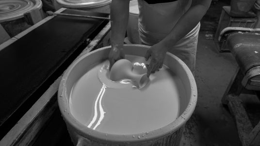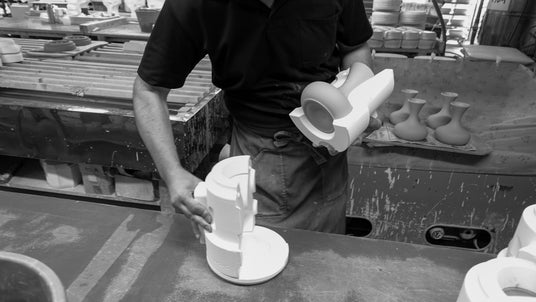 このカラフェは、「排泥鋳込(はいでいいこみ)」と呼ばれる製法で、陶土を水で溶かした液状の泥漿(でいしょう)を石膏型に流し込み、石膏が水分を吸収することで内側の泥漿が少しずつ固まります。目標とする厚さに達した段階で型を反転させ、余分な泥漿を排出します。