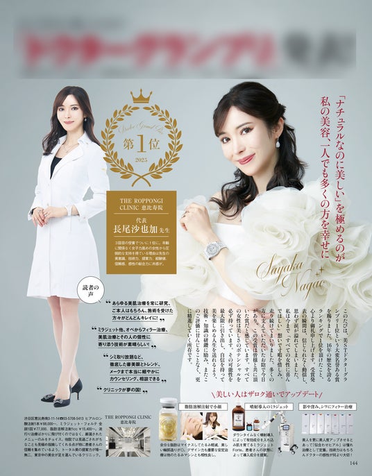 この度、光文社の美容雑誌『美ST』が主催する連載企画「美容医療ドクターグランプリ 2025」において、THE ROPPONGI CLINIC(ザ・ロッポンギ・クリニック)長尾 沙也加医師が第1位を受賞いたしました。