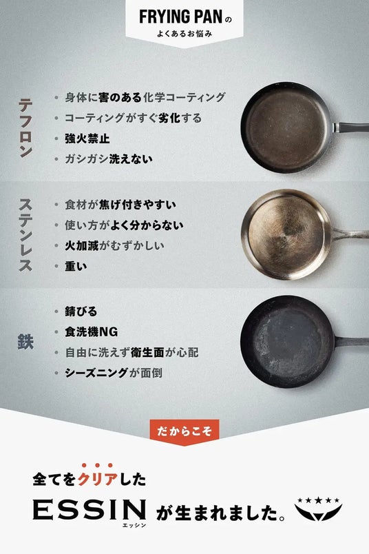その全てを解決するために次世代のステンレスフライパンであるESSIN(エッシン)は生まれました。