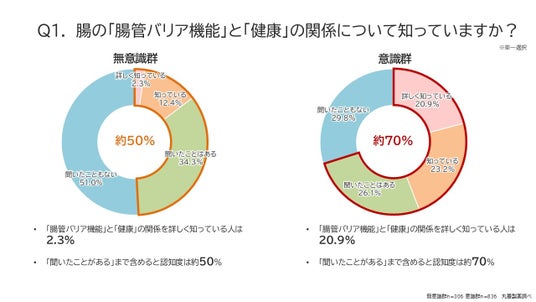 本調査では、意識的に腸活を行っている群では、腸管バリア機能と健康の関係について「詳しく知っている」と答えた人が20.9%で、無意識群の2.3%に比べて約10倍の認知度となりました。