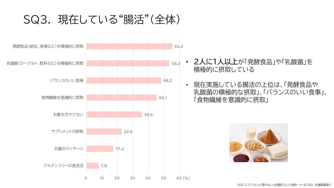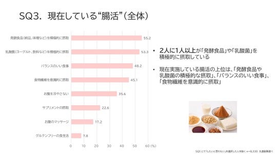 腸活事例に関する質問では、2人に1人以上が「発酵食品」や「乳酸菌」を積極的に取り入れていることが分かりました。