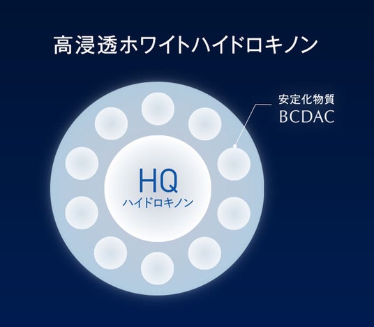 高浸透ホワイトハイドロキノンは、安定化物質であるセタルコニウムクロリド(BCDAC)がハイドロキノン分子を包み込む独自構造を持つ成分です。これにより、従来課題とされてきたハイドロキノンの不安定さを克服し、成分を安定した状態で保持すると同時に、高い浸透性を実現しました。