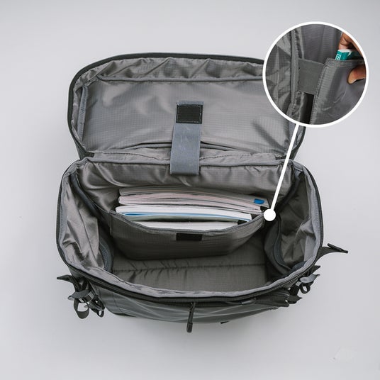 教科書やPCを出し入れしやすい箱型デザインを採用しました。背面側の収納スペースは両端をゴム仕様にした独自構造。これにより、タブレットやPCはもちろん「厚みのある複数の教科書」もまとめてホールドでき、リュックを背負う時に中身が踊るのを防いで身体への負担を軽減します。