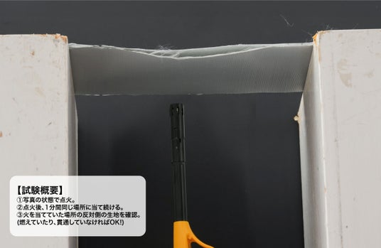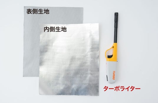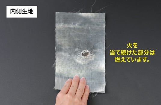なお、モバイルバッテリーが発火したことを想定し、表側生地と内側生地2枚を重ねた状態で内側のみに火をあてて検証しました。