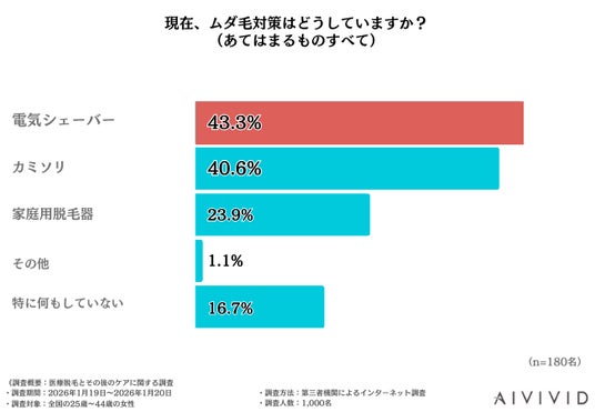 ここからは、脱毛完了後に気になるムダ毛のケアについて聞いていきます。『現在、ムダ毛対策はどうしていますか?(あてはまるものすべて)』と聞いたところ、「電気シェーバー(43.3%)」「カミソリ(40.6%)」「家庭用脱毛器(23.9%)」と続き、「特に何もしていない(16.7%)」でした。