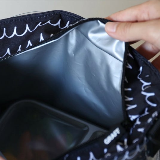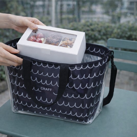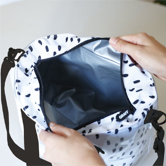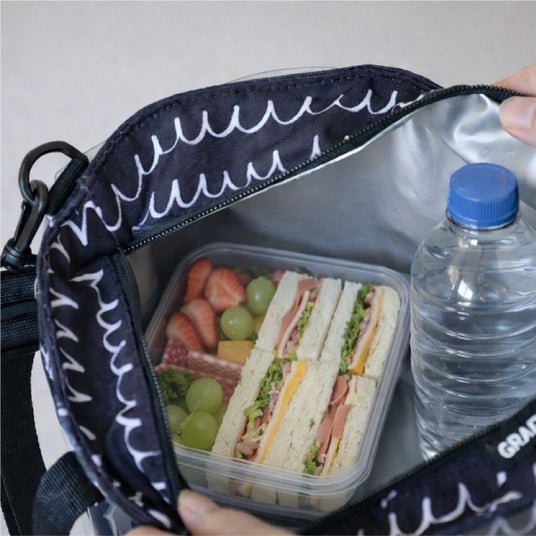 内側の保冷ポーチは、デザイン性を損なわず、食品や飲み物の温度変化を抑えます。