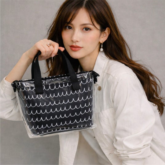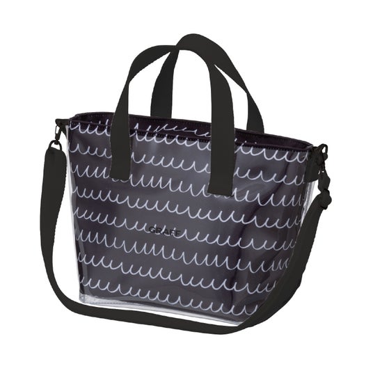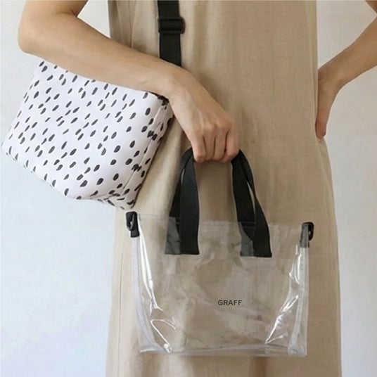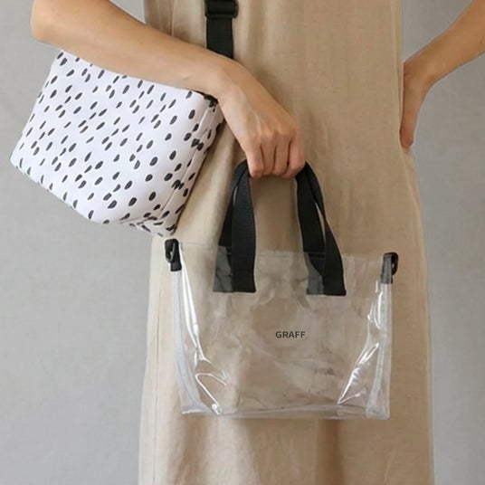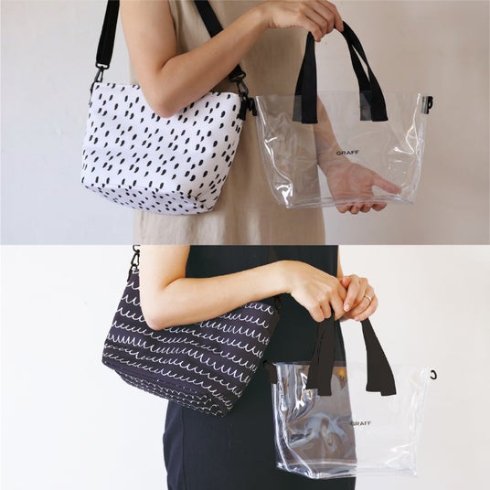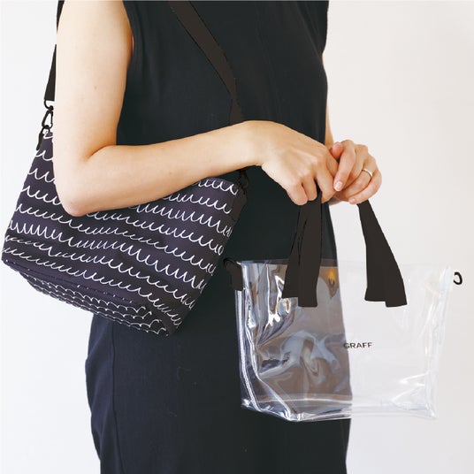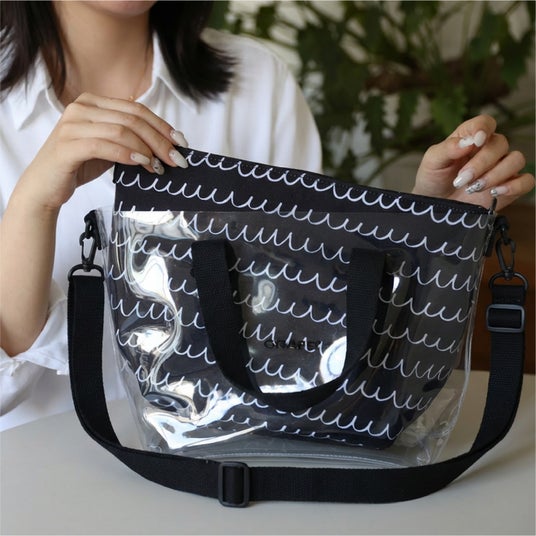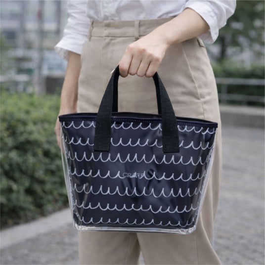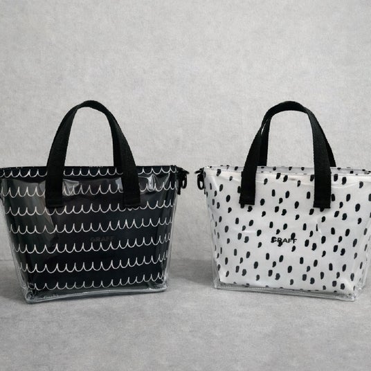 外側は透明感のあるクリアバッグ、内側は落書き風パターンが印象的な保冷ポーチ。