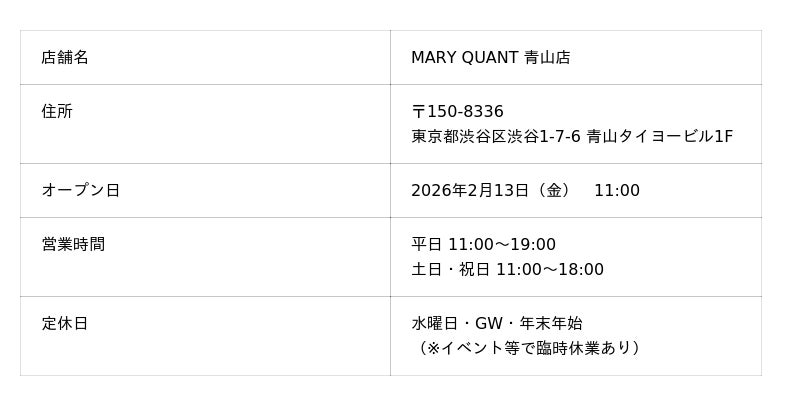株式会社 マリークワント コスメチックス(本社:東京都渋谷区、代表取締役社長:陶 正治)は、2026年2月13日(金)、東京・渋谷に「MARY QUANT 青山店」をオープンいたします。