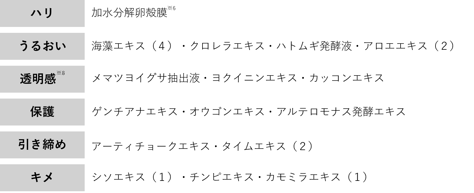 <有効成分>アラントイン、ブタプラセンタエキス-1<その他の成分>加水分解卵殻膜、オウゴンエキス、ヨクイニンエキス、アロエエキス(2)、メマツヨイグサ抽出液、チンピエキス、ゲンチアナエキス、ハトムギ発酵液、シソエキス(1)、タイムエキス(2)、アルテロモナス発酵エキス、カモミラエキス(1)、カッコンエキス、クロレラエキス、アーティチョークエキス、海藻エキス(4)、ホエイ(2)、含硫ケイ酸アルミニウム、加水分解ヒアルロン酸、プロポールマンナンゲル化物、精製水、ジプロピレングリコール、濃グリセリン、1,3-ブチレングリコール、トリ2-エチルヘキサン酸グリセリル、カルボキシビニルポリマー、塩化ジココイルジメチルアンモニウム、塩化セチルトリメチルアンモニウム、イソプロパノール、フェノキシエタノール、エタノール、香料
