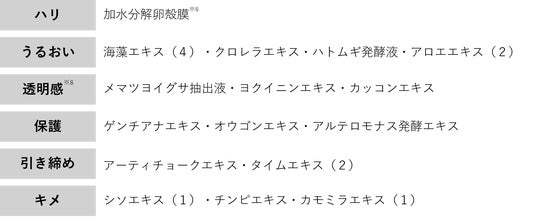 美白※1有効成分「プラセンタエキス※5」と肌荒れ防止有効成分「アラントイン」の他、卵殻膜※6をはじめとした16種類の天然保湿成分を配合したことで、乾燥やつっぱり感を感じさせずに柔らかさやうるおいに満たされた肌に仕上がるように設計しています。
