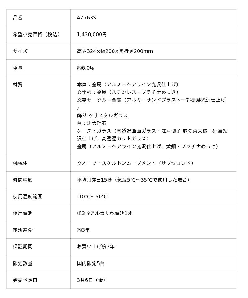 セイコーウオッチ株式会社(代表取締役会長兼 CEO 兼 CCO:服部 真二、本社:東京都中央区)は、クロックの最高級ブランドである<デコールセイコー>より、国の伝統的工芸品※に指定された江戸切子をガラスケースに用いた置時計を、3月6日(金)より発売いたします。希望小売価格は1,430,000円(税込)、国内限定5台です。