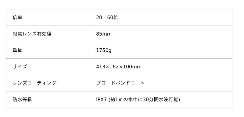 85mmの大型レンズと20倍から60倍の拡大調整が可能なため、明るくクリアな画像を提供。