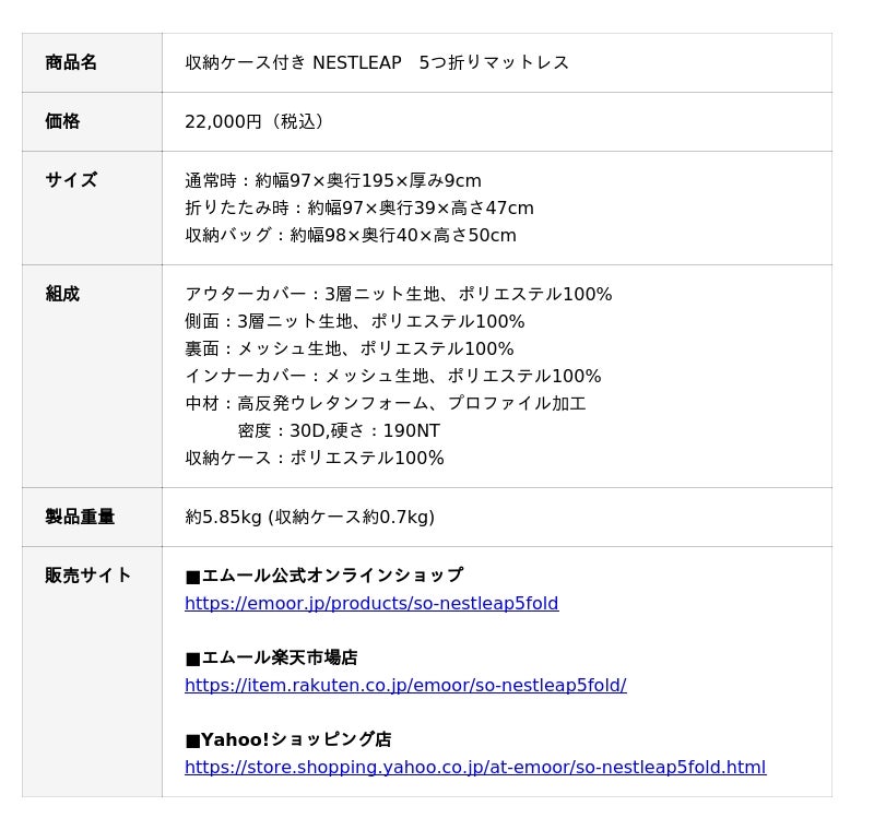 「身体に合った寝る・座る・たたむ」を提供する健康家具ブランドEMOORを展開する株式会社エムール(東京都立川市:代表取締役 高橋 幸司/以下、エムール)は、2026年2月2日より『NESTLEAP(ネストリープ)5つ折りマットレス(以下、ネストリープ5つ折りマットレス)』の販売を開始しました。