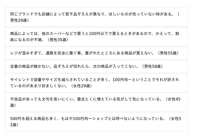 ☆100円ショップ利用時の不満点/利用しない理由(全4,200件)