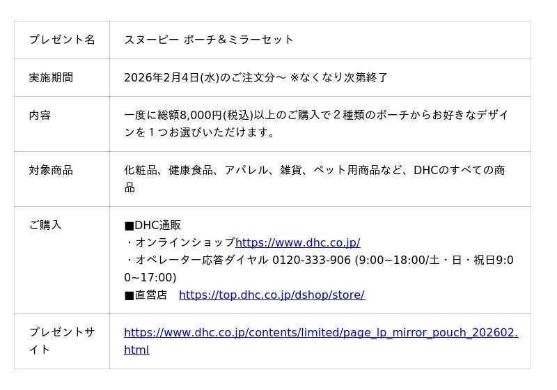 株式会社ディーエイチシー(本社:東京都港区、代表取締役社長:宮崎 緑、以下:DHC)は、2026年2月4日(水)より、DHC通販および全国の直営店にて、1回のお買い上げ金額が総額8,000円(税込)以上※1のお客様を対象に、DHCオリジナル「スヌーピー ポーチ&ミラーセット」を1つプレゼント※2するキャンペーンを実施いたします。