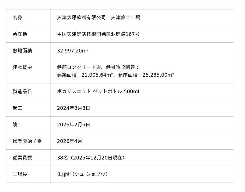 大塚製薬大塚製薬株式会社(本社:東京都、代表取締役社長 井上 眞、以下「大塚製薬」)の子会社である天津大塚飲料有限公司(以下「天津大塚飲料」)は、事業を展開する中国北部でのポカリスエットの需要拡大に対応するため、同社2つ目となる新工場「天津第二工場」を開設し、2月5日に竣工式を行いました。新工場は既存工場と同様に見学者を対象とした水分・電解質補給の大切さを伝える活動も行います。