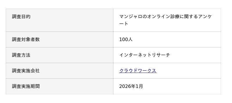 マンジャロのオンライン診療の経験がある100名を対象に、計6項目の質問を設け、アンケート調査を行いました。