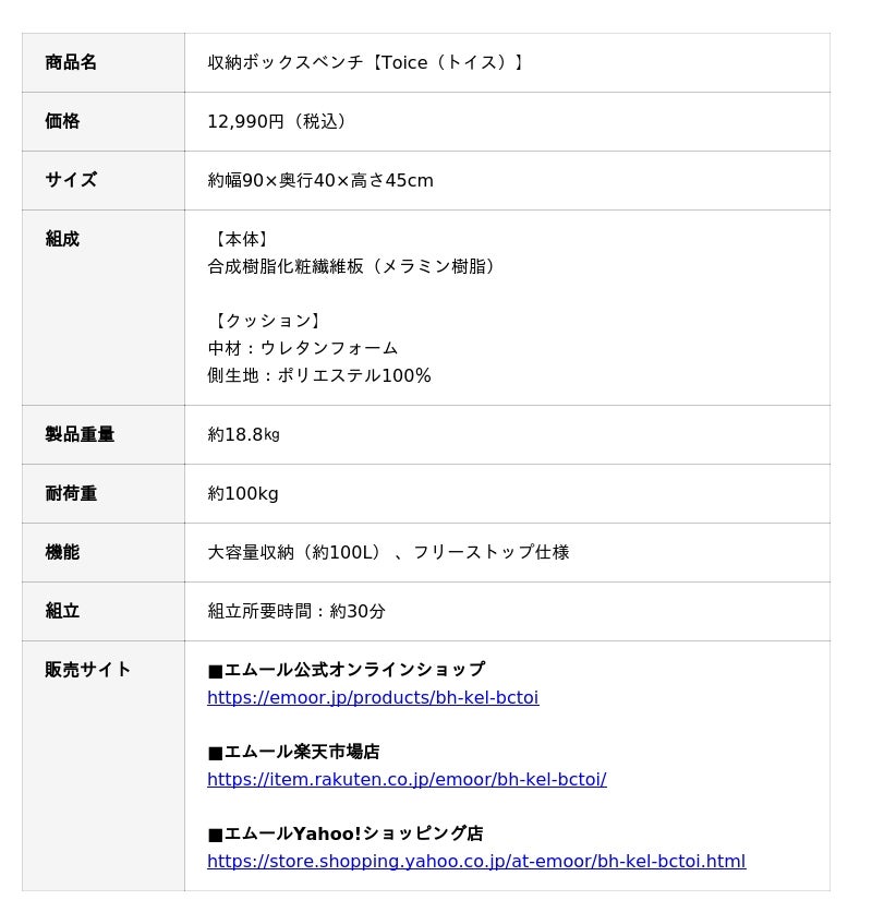 株式会社エムール“寝る・座る・たたむ”に専門性を持つ健康家具ブランドEMOOR(エムール)は、空間をすっきり整え、暮らしに寄り添う収納ボックスベンチ【Toice(トイス)】の販売を開始しました。