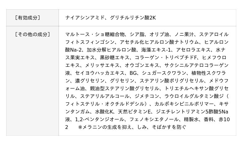 シワを改善する。メラニンの生成を抑え、しみ、そばかすを防 ぐ。肌荒れ・荒れ性。肌を清浄にする。肌を整える。皮膚をす こやかに保つ。皮膚にうるおいを与える。◇着色料フリー