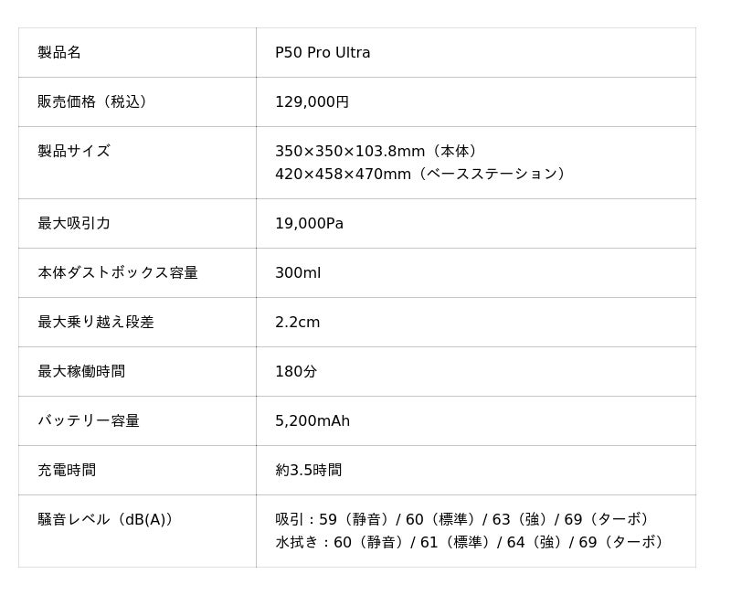 MOVA「P50 Pro Ultra」のスペック詳細