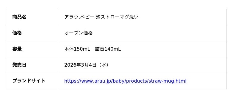 サラヤ株式会社(本社:大阪/代表取締役社長:更家悠介)は、「アラウ.ベビー 泡ストローマグ洗い」を、2026年3月4日(水)より、発売することをお知らせいたします。