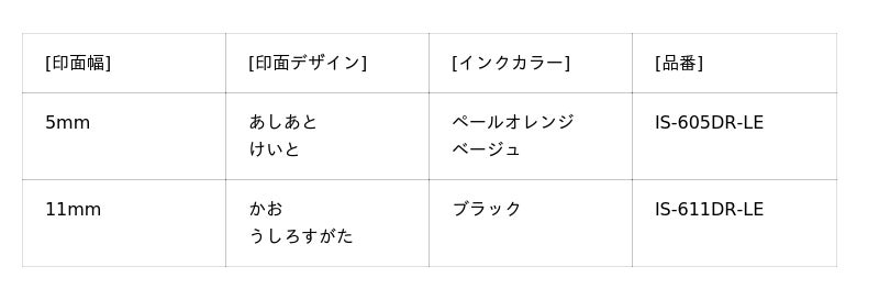 印面の柄は、ネコ好きの心をくすぐる4種類のデザインをラインアップ。5mm幅の「あしあと」と「けいと」の2種類は、非常に淡いインクカラーなので、両方の柄を組み合わせたり、アンダーラインとしてほんのり色付けを楽しむのにおすすめです。11mm幅は「かお」「うしろすがた」の2種類。いずれもシンプルなブラック色なので、上から色を塗ったり、デザインを書き加えることで、好きなネコに変身させることができます。