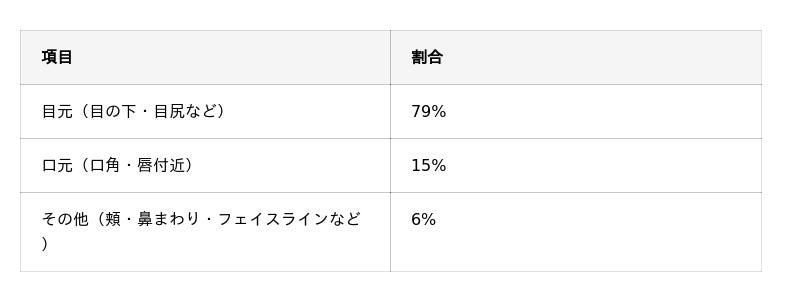 「口元(口角・唇付近)」(15%)と比べると約5倍の差があり、目元への施術が特に高い人気を集めていることが分かります。