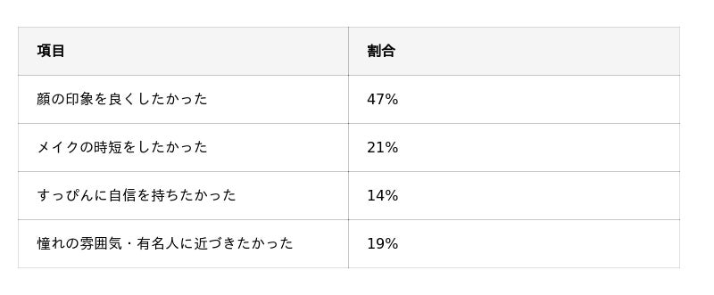 そのほか、「メイクの時短をしたかった」(21%)や「憧れの雰囲気・有名人に近づきたかった」(19%)などにも回答が集まっており、回答は複数の項目に分散する結果となりました。