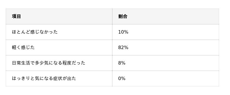 さらに、「ほとんど感じなかった」(10%)を含めると、全体の92%が軽度の症状にとどまったと回答しています。