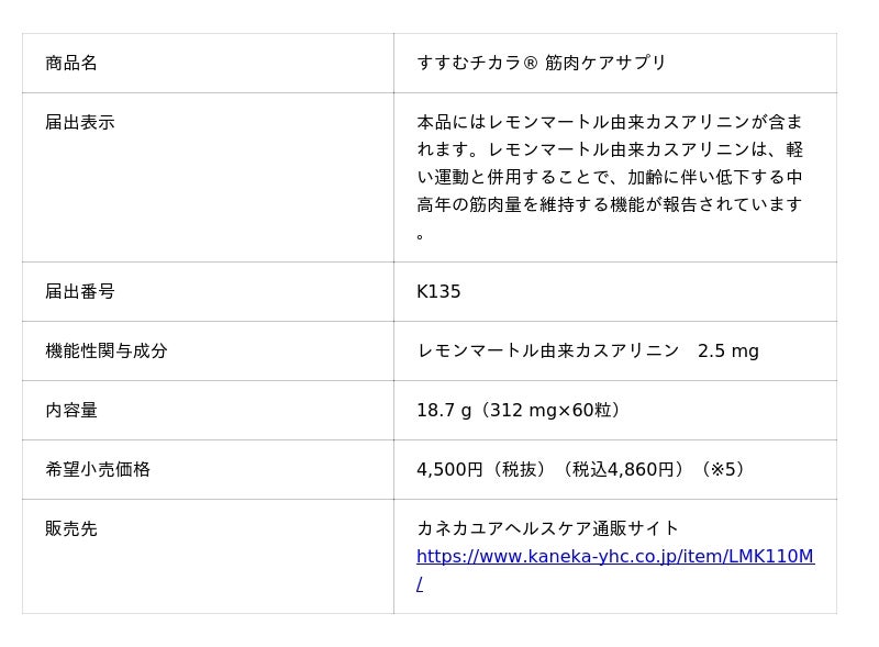 株式会社カネカ株式会社カネカ(本社:東京都港区、社長:藤井 一彦)は、グループ会社であるカネカユアヘルスケア株式会社(本社:東京都港区、社長:三宅 郁子)を通じて、レモンマートル由来カスアリニン(※1)を日本で初めて配合(※2)した機能性表示食品『すすむチカラ(R) 筋肉ケアサプリ』を、2月18日(水)よりリニューアル発売します。