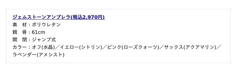 淡いカラーにキラキラと光るシルバーのプリント、そして宝石のカットをイメージしたシャープな形が印象的な5色の『ジェムストーンアンブレラ』。オフにはすべてをクリアに導く水晶、イエローには希望と自信をもたらすシトリン、ピンクには優しい愛を育むローズクォーツ、サックスには流れを整える穏やかなアクアマリン、ラベンダーには心に静けさをもたらす癒しのアメシストの天然石チャームが付いています。雨の日にはあなたの味方となり、幸運の雨をもたらしてくれるはず。