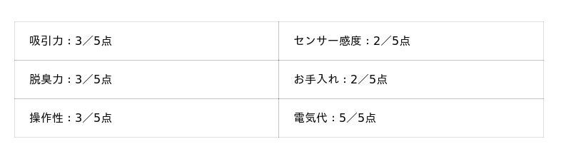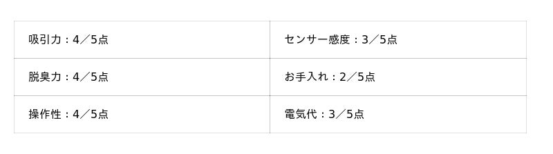 - 脱臭力:5点満点