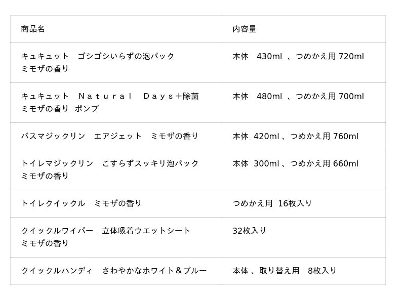 また、「キュキュット」「マジックリン」「クイックル」から、新しい生活のスタートを応援し、さわやかで清々しい「ミモザ」の香りやデザインを施した計7アイテム*1 を数量限定で2026年2月2日から発売しています。