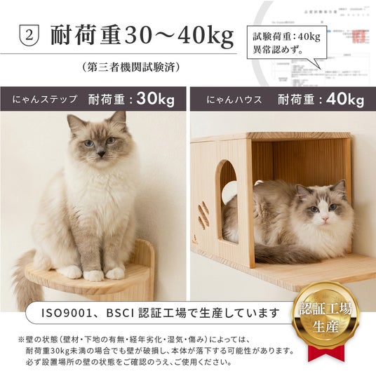 2,耐荷重30~40kgの安心設計にゃんステップは耐荷重30kg、にゃんハウスは耐荷重40kgの設計。