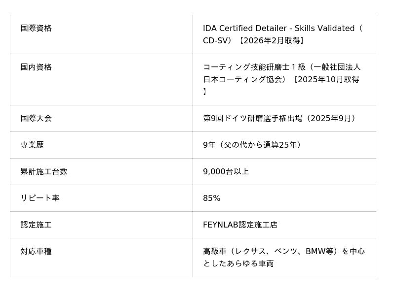 「ドイツの世界大会で、世界中の技術者と同じ舞台で競い合えたことは、私にとって本当に大きな経験になりました。 そして同時に、こうした大会をいつか日本でも開催したいと強く思うようになりました。日本のカーディテーラーは世界的に見てもレベルが高く、このような大会が日本で開催されることで、業界全体がさらに盛り上がっていくと感じています。今後はコーティング協会やJDA(日本ディテーリング協会)の皆様と日本のカーディテイリングを盛り上げたいです。 IDA認定CD-SV、そしてコーティング技能研磨士1級の取得は、お客様に対する私たちの約束です。大切なお車を、世界で通用する技術と、日本の厳しい基準に裏付けられた品質で守るその想いを、資格という形でお見せできたと考えています。 父の代から築いてきた信頼を大切にしながら、世界で学んだ技術を沖縄の皆様に還元し続けます。これからも学びを止めず、さらに上を目指していきます。