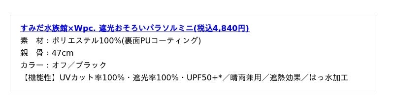 またWpc.の日傘は、UVカット率100%・遮光率100%・UPF50+の生地*を使用。はっ水加工も施されているので雨の日でもお使いいただける晴雨兼用です。