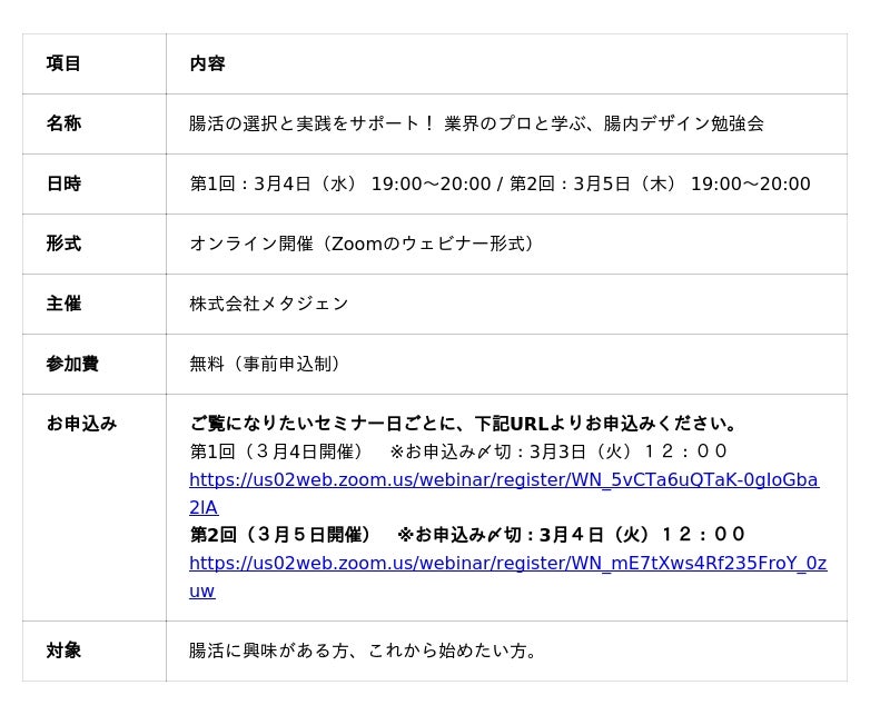 近年、腸活ブームにより多くの情報が溢れる一方で、「何を選べばよいかわからない」という悩みも増えています。本セミナーは、企業単体の枠を超え、腸内環境に関する正しい知識を業界全体で広めたいという志を持つGDP参画企業7社が連携して開催します。 「おなかの世界の奥深さ」や、知っておくと日々の腸活がクリアになる「豆知識」など、専門家ならではの視点で、楽しみながら学んでいただける場を提供いたします。